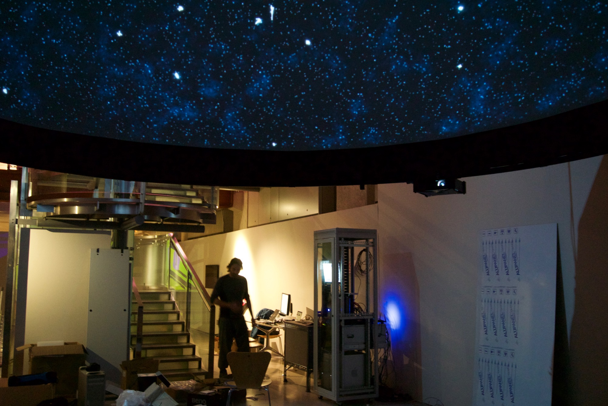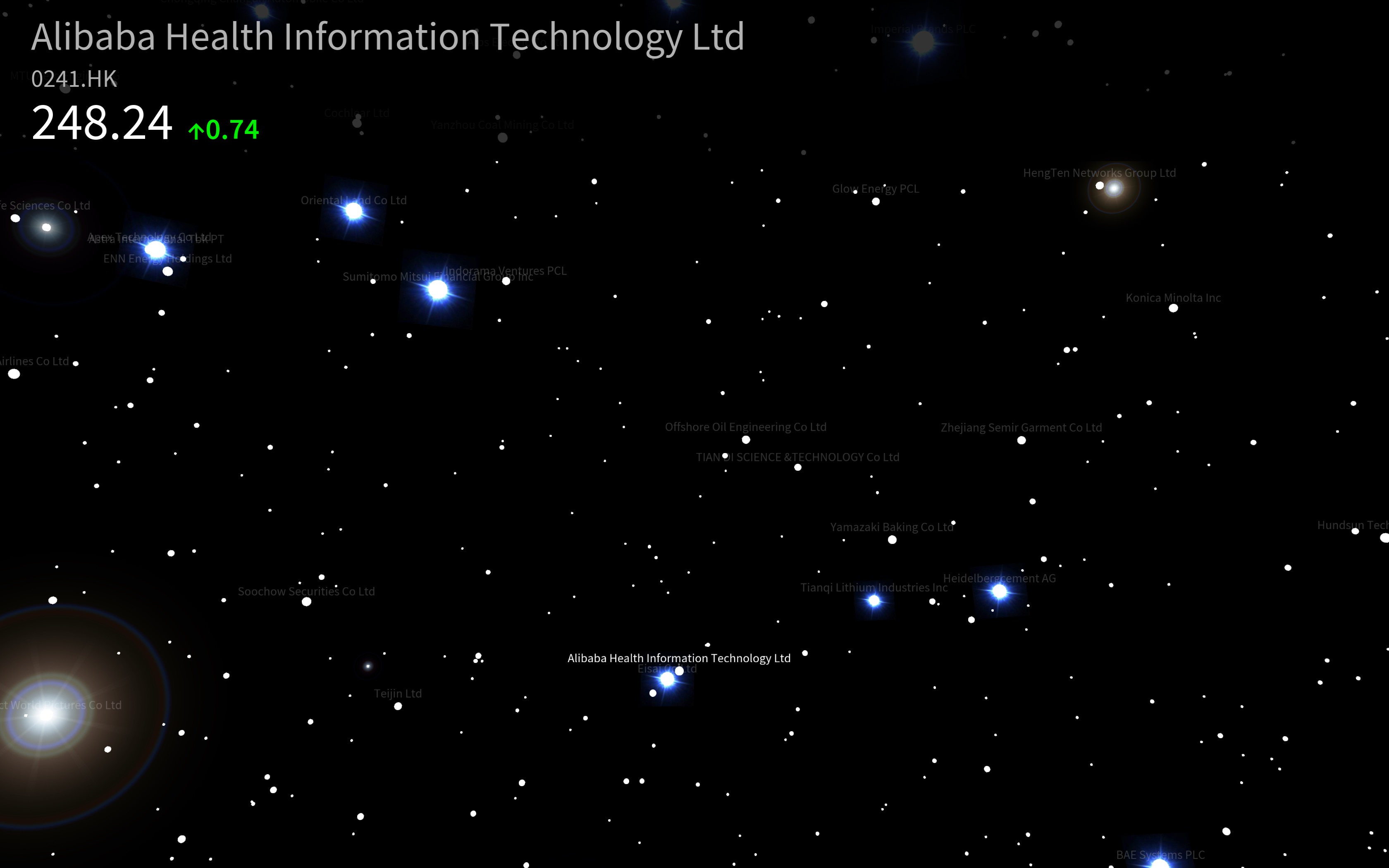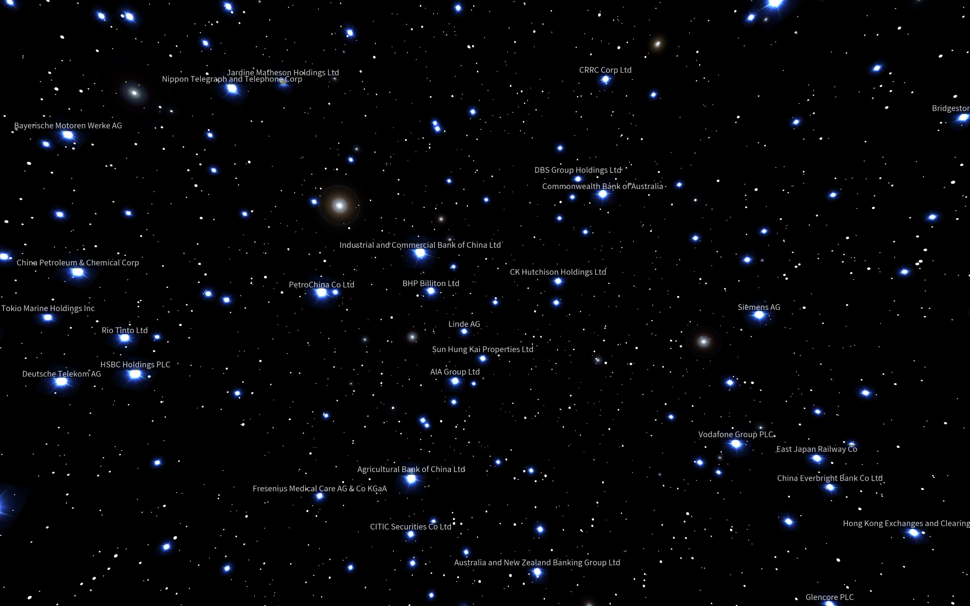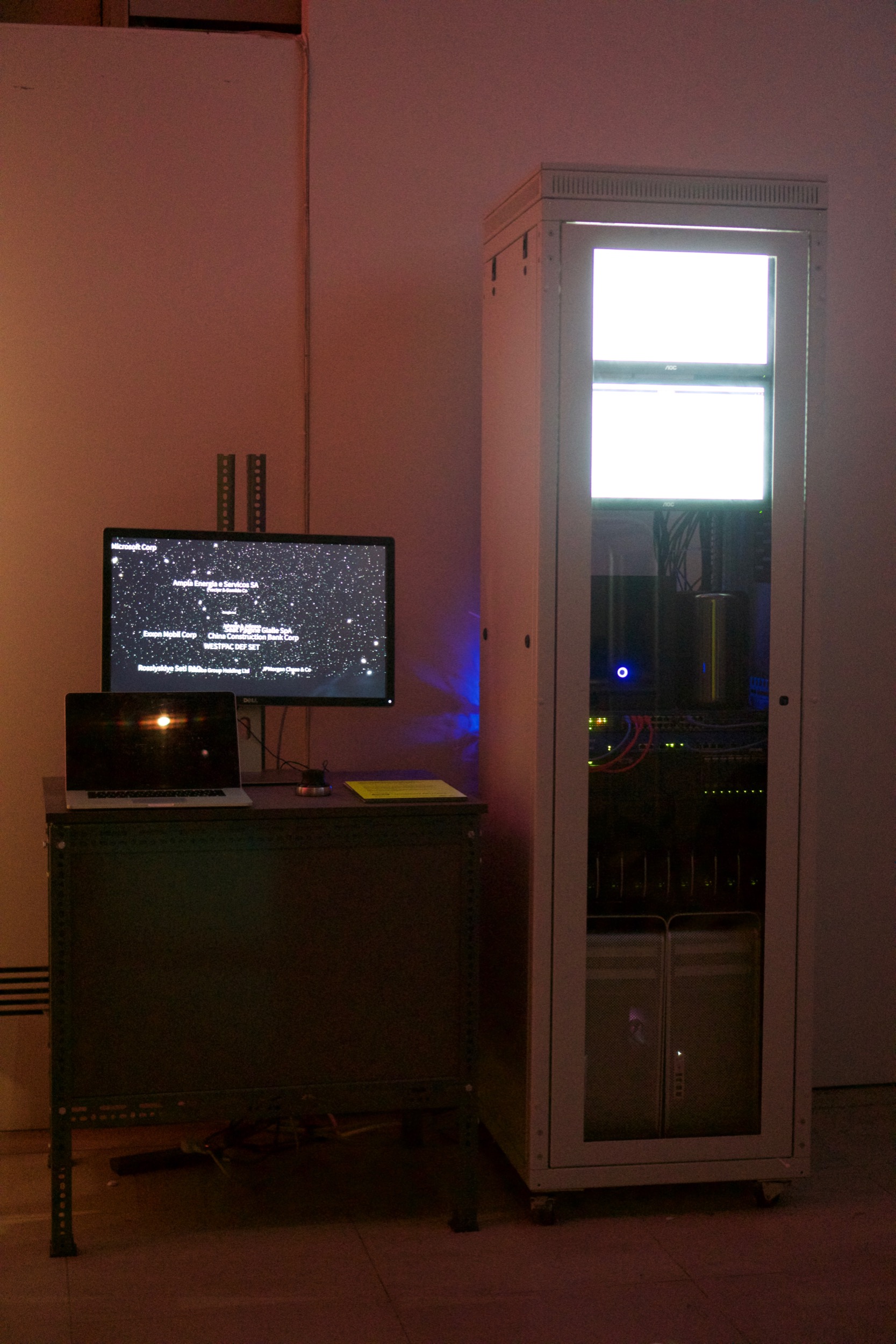 Thousands of companies from across the world are represented as stars that flicker and glow in as shares are traded on various stock exchanges. The brightness and duration of the glow indicates the volume of the trading activity and the stars slowly drift in response to the complex movements of capital in the markets. My role on this project was that of Chief Programmer, responsible for design and implementation of most of the software portion of the project.